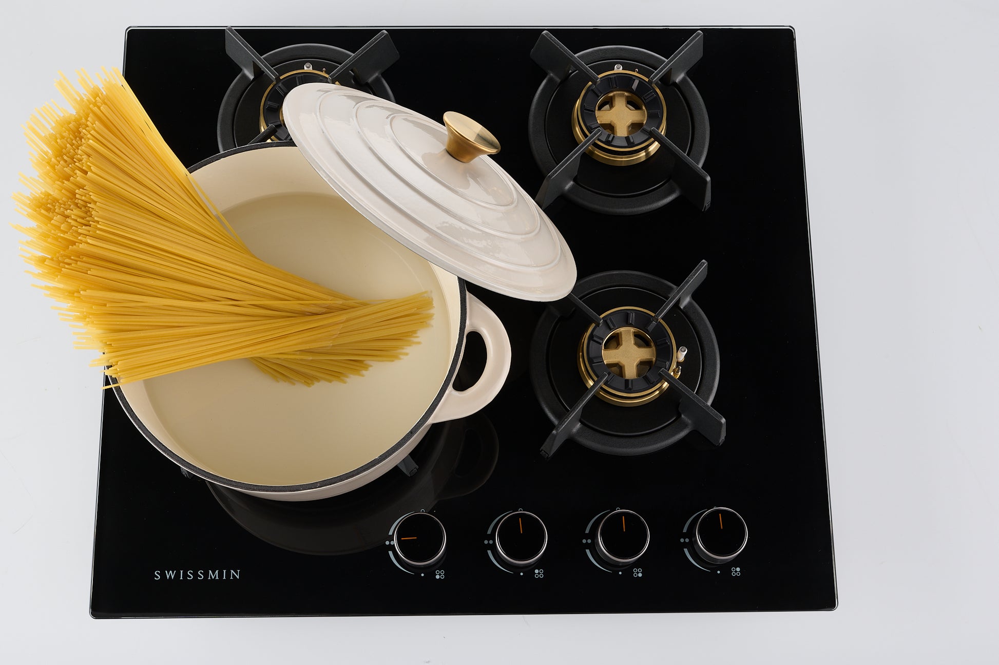 Swissmin 60cm Black Glass Gas Hob with 4 Brass Burners